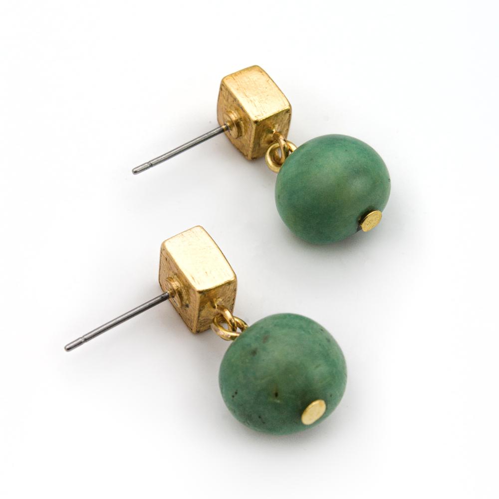 Orecchini pendenti con elemento a forma di cubo in metallo placcato oro e una perla di acai. Chiusura a perno in acciaio inossidabile anallergico. Lunghezza orecchino 2 cm