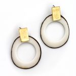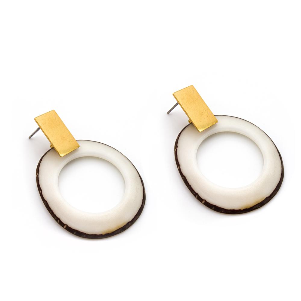 Orecchini pendenti con elemento a forma rettangolare in metallo placcato oro e un anello di tagua. Chiusura a perno in acciaio inossidabile anallergico. Lunghezza orecchino 5 cm