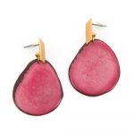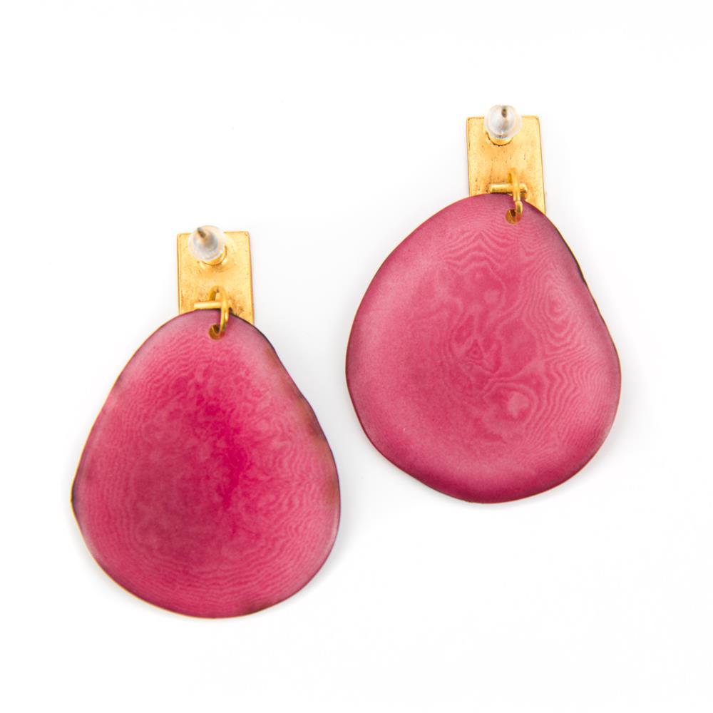 Orecchini a perno placcati oro anallergico arricchiti da un disco di tagua irregolare ed un elemento placcato oro. Lunghezza: 5cm