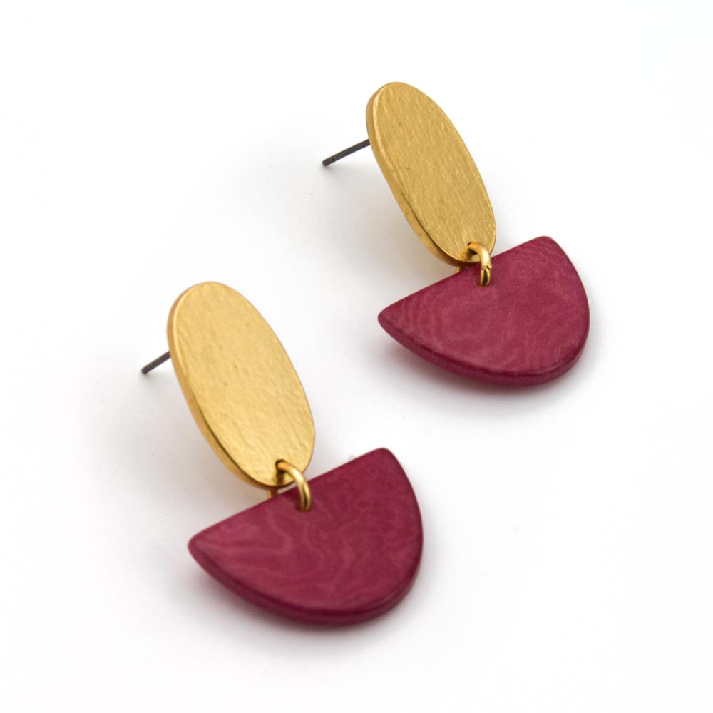 Orecchini pendenti con elemento ovale placcato oro e un elemento in tagua a forma di mezzaluna. Chiusura a perno in acciaio inossidabile anallergico. Lunghezza orecchino 3,5 cm