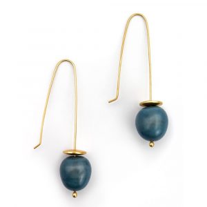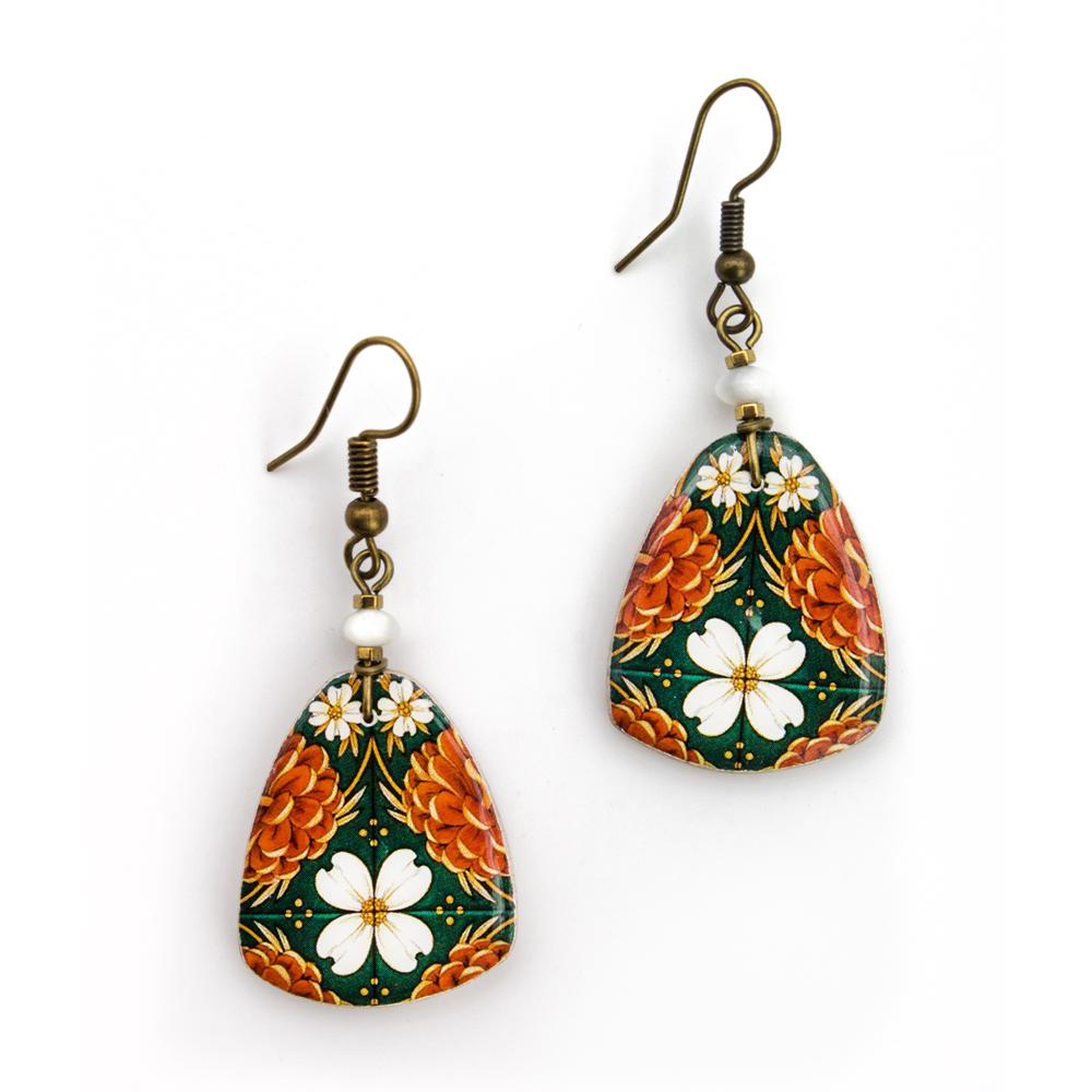 Orecchini pendenti con ciondolo a forma di foglia in ceramica a freddo decorata, illuminati da piccole perline in vetro. Chiusura con gancio ad amo in metallo anallergico colore bronzo effetto anticato.