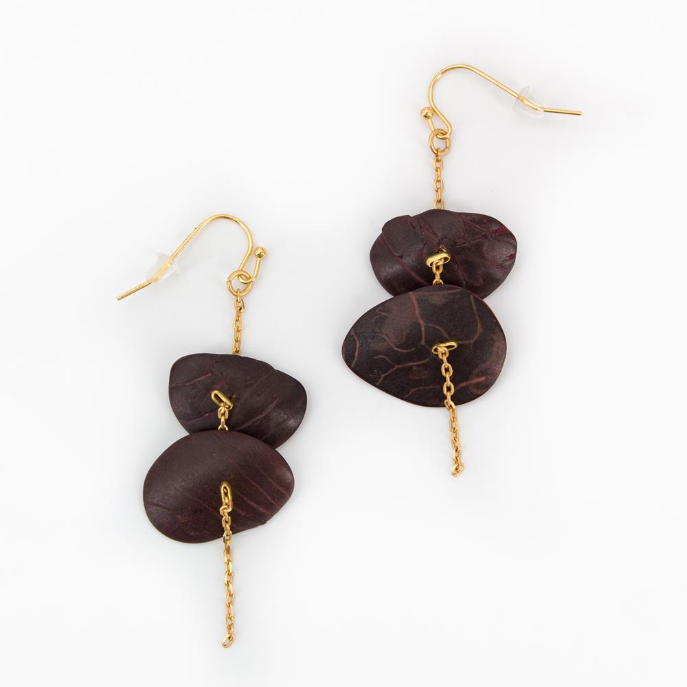 Orecchini pendenti con due sottili pezzi di tagua su una sottile catenina dorata. Chiusura con gancio in metallo placcato oro anallergico. Dimensione: 5 cm