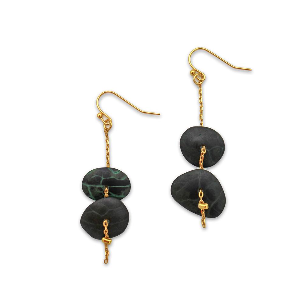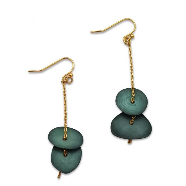 Orecchini pendenti con due sottili pezzi di tagua su una sottile catenina dorata. Chiusura con gancio in metallo placcato oro anallergico. Dimensione: 5 cm
