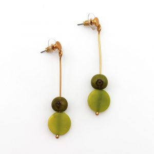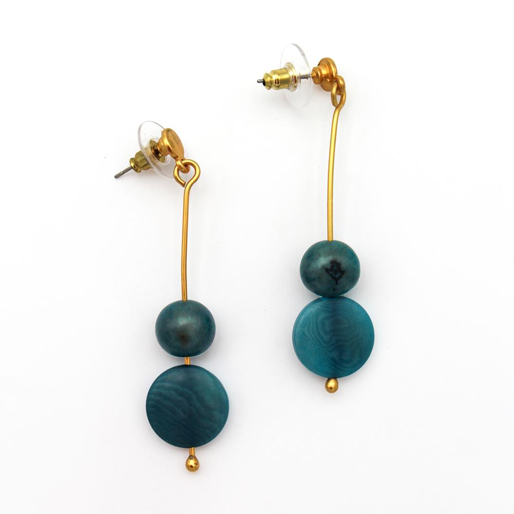 Orecchino pendente con una perla di acai e un mini disco in tagua su un gancio a stelo placcato oro anallergico. Chiusura a perno in acciaio inossidabile anallergico. Dimensione: 6 cm