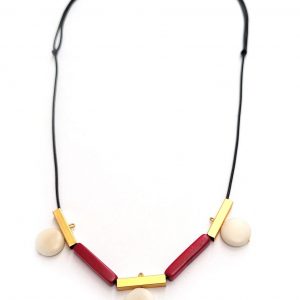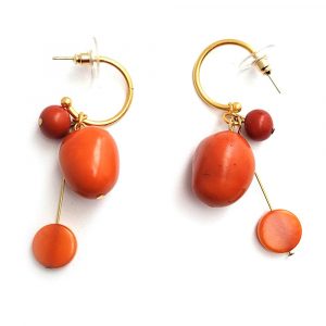 Orecchini pendenti con una perla di acai, un disco di tagua e un elemento dorato su una sottile catenina in metallo placcato oro. Chiusura a perno in acciaio inossidabile anallergico. Dimensione: 7 cm