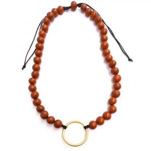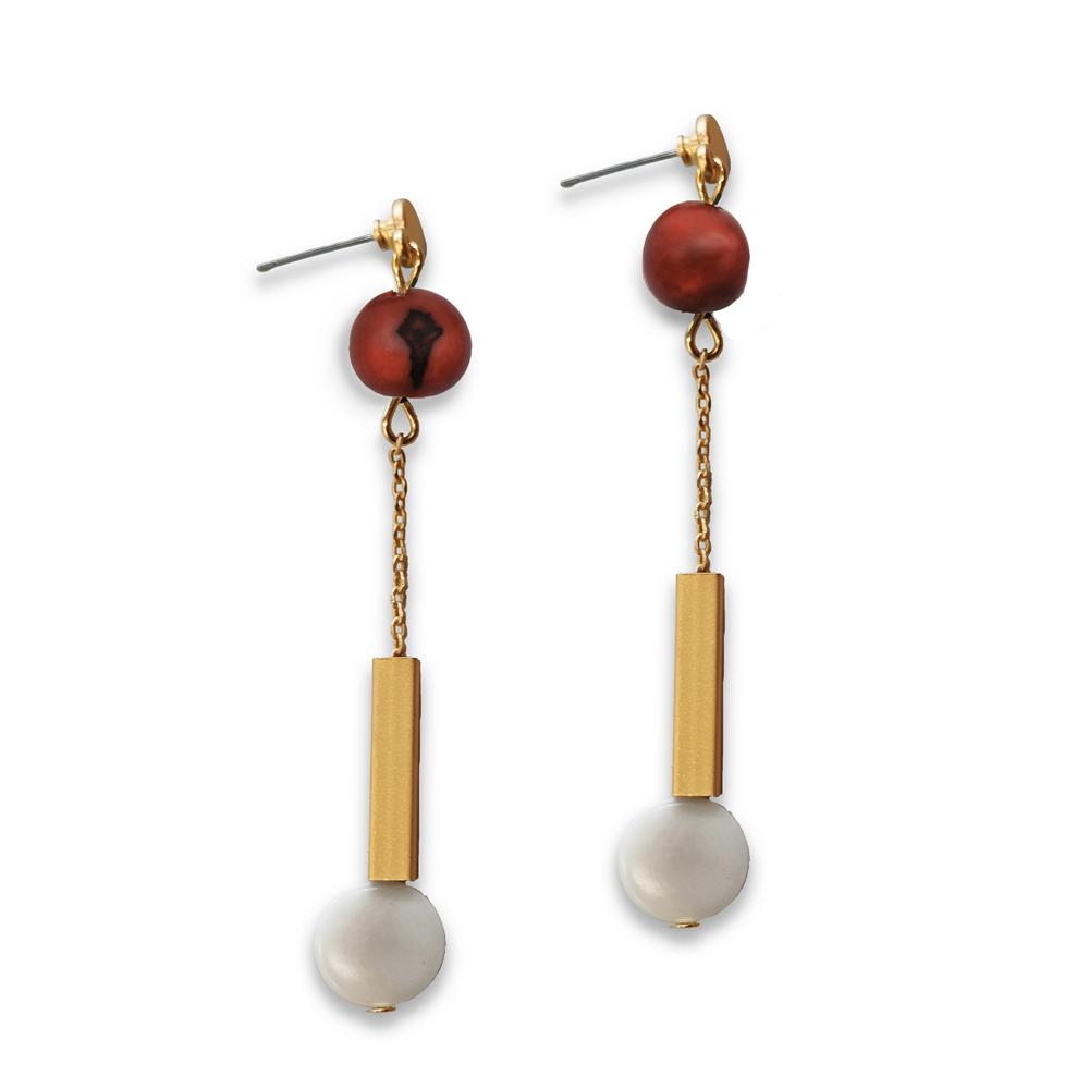 Orecchini pendenti con una perla di acai, un disco di tagua e un elemento dorato su una sottile catenina in metallo placcato oro. Chiusura a perno in acciaio inossidabile anallergico. Dimensione: 7 cm