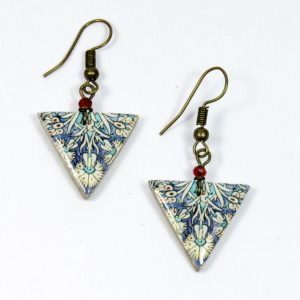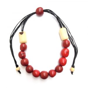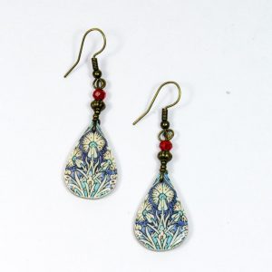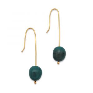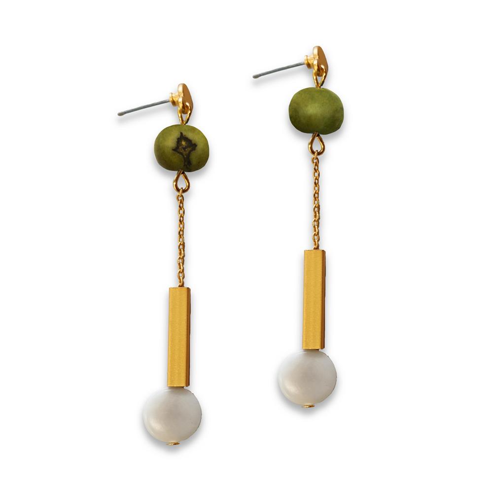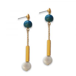 Orecchini pendenti con una perla di acai, un disco di tagua e un elemento dorato su una sottile catenina in metallo placcato oro. Chiusura a perno in acciaio inossidabile anallergico. Dimensione: 7 cm
