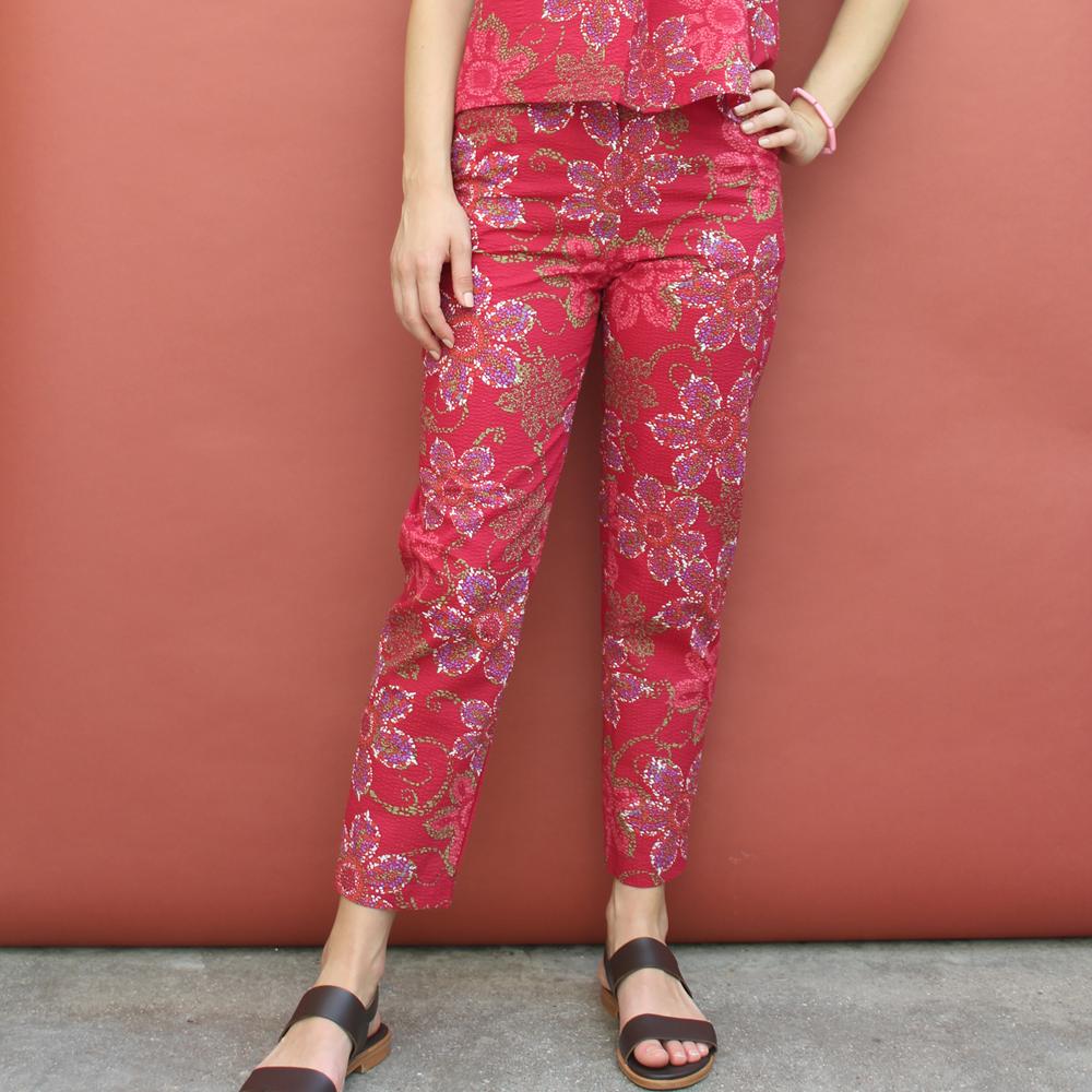 100% cotone seersucker stampato, stampa floreale ibisco, magenta, lavanda, verde palma