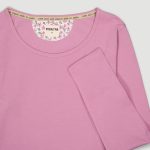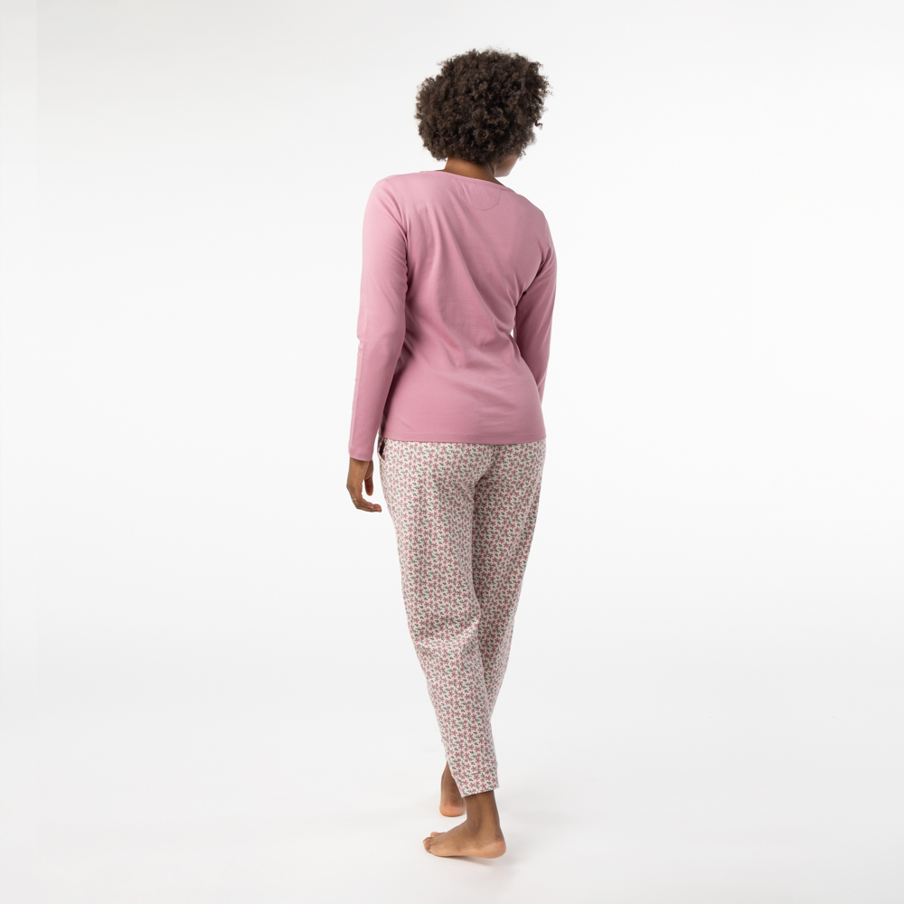 Maglia tinta unita lilo. Pantalone: sfondo bruma, fiori lilo e ceniza. Tessuto: Interlock