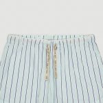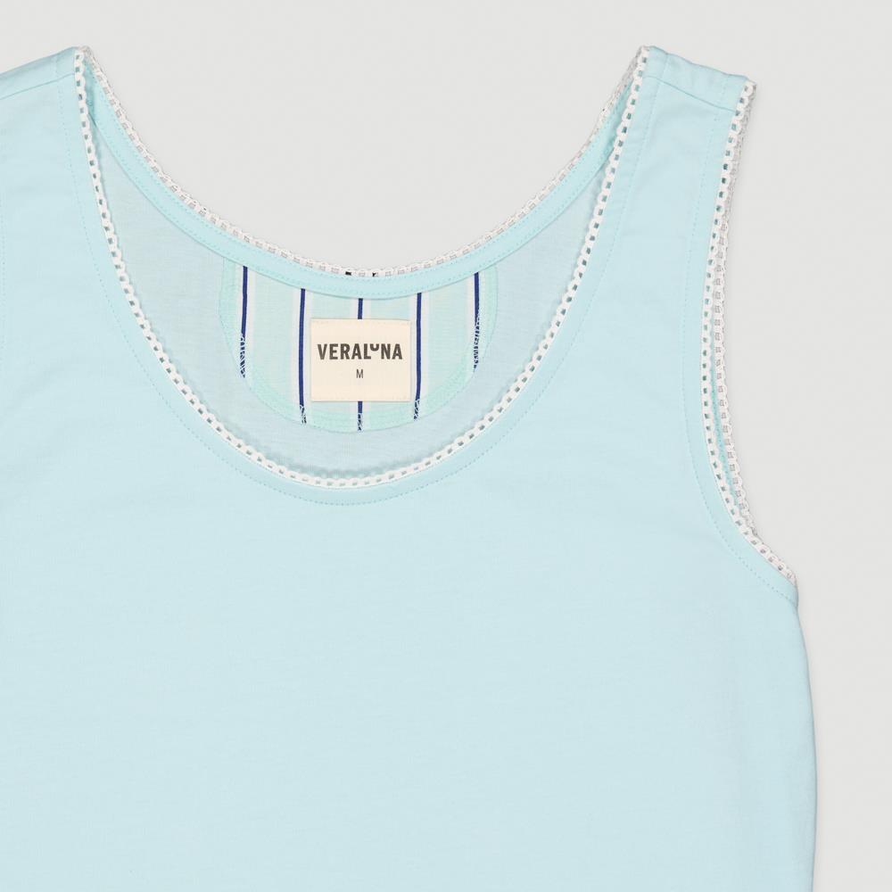 Maglia azzurro tenue. Disegno righe: azzurro tenue,avorio chiaro,blu profondo. Tessuto: single Jersey + voile di cotone
