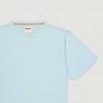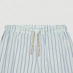Maglia azzurro tenue. Disegno righe: azzurro tenue,avorio chiaro,blu profondo. Tessuto: single Jersey + voile di cotone