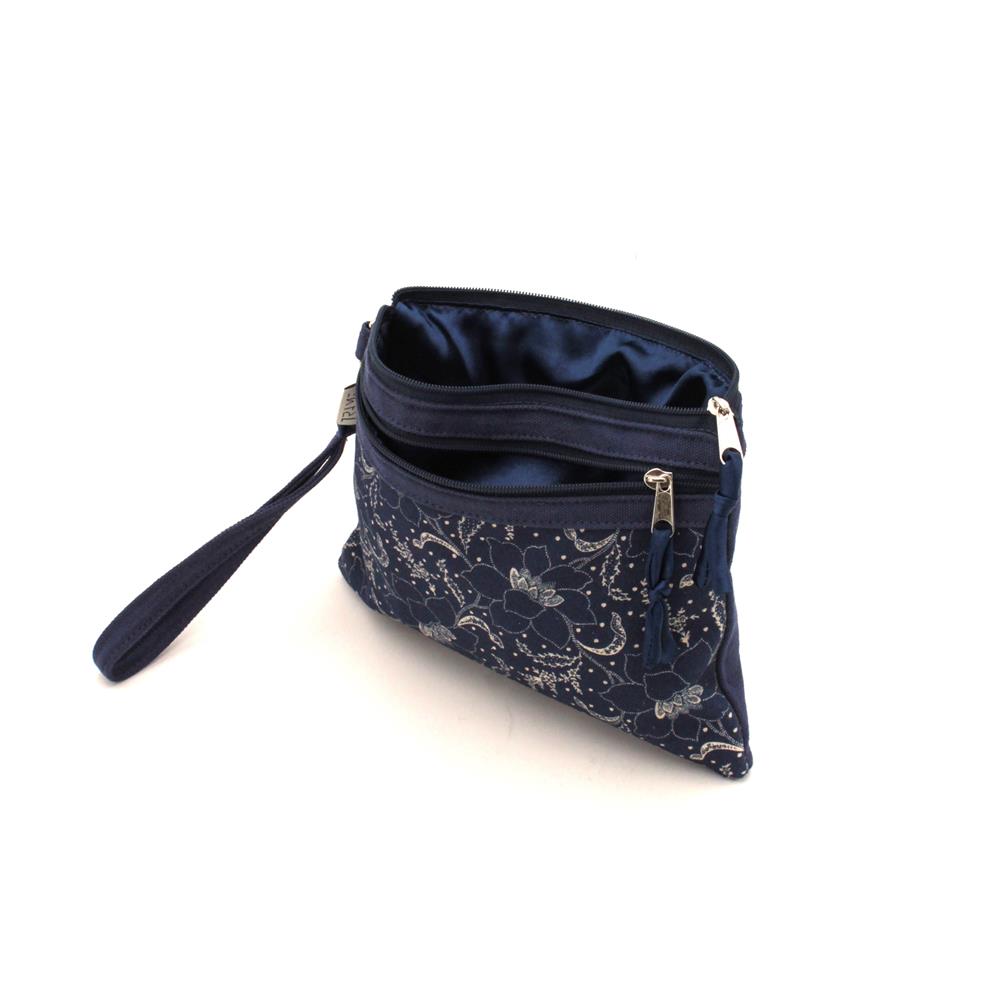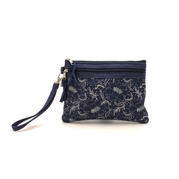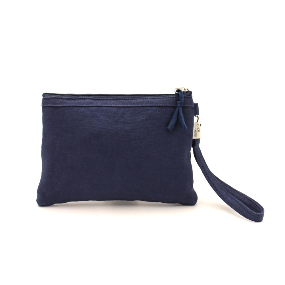 Pochette da portare a mano in cotone canvas stampato su colore base blu rodonite. Dotata di un piccolo manico. Due scomparti con zip e interni foderati.