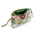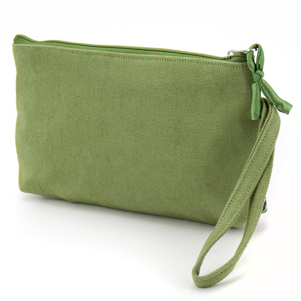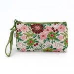 Pochette da portare a mano in cotone broccato fantasia floreale colore base cipria e cotone canvas colore verde. Dotata di un piccolo manico. Chiusura con zip. Interno foderato. 21,5×11,5 cm