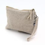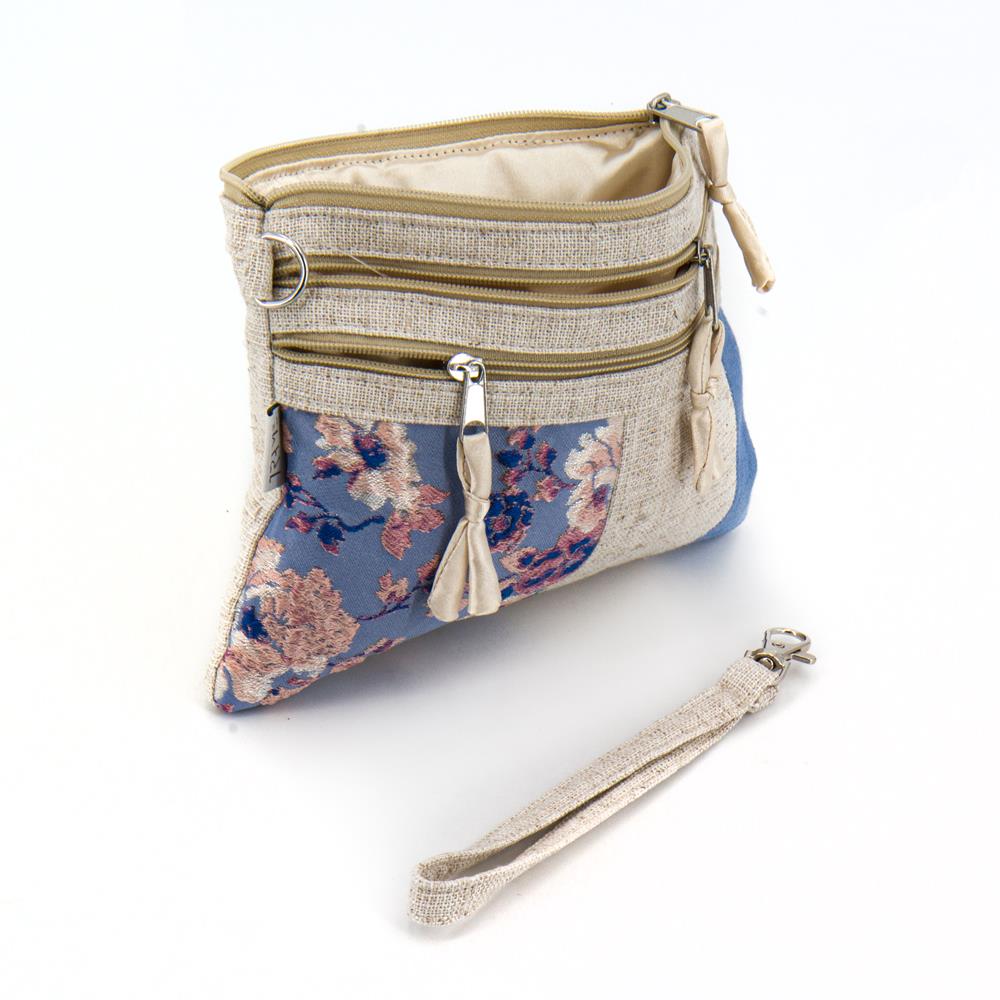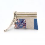 Pochette da portare a mano in mix di tessuti e fantasie su base lino ecrù. Dotata di un piccolo manico. Tre scomparti con zip e interni foderati. 20×15 cm