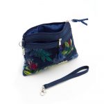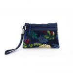 Pochette da portare a mano in velluto liscio con stampa floreale su colore base blue e cotone canvas blu. Dotata di un piccolo manico. Tre scomparti con zip e interni foderati.