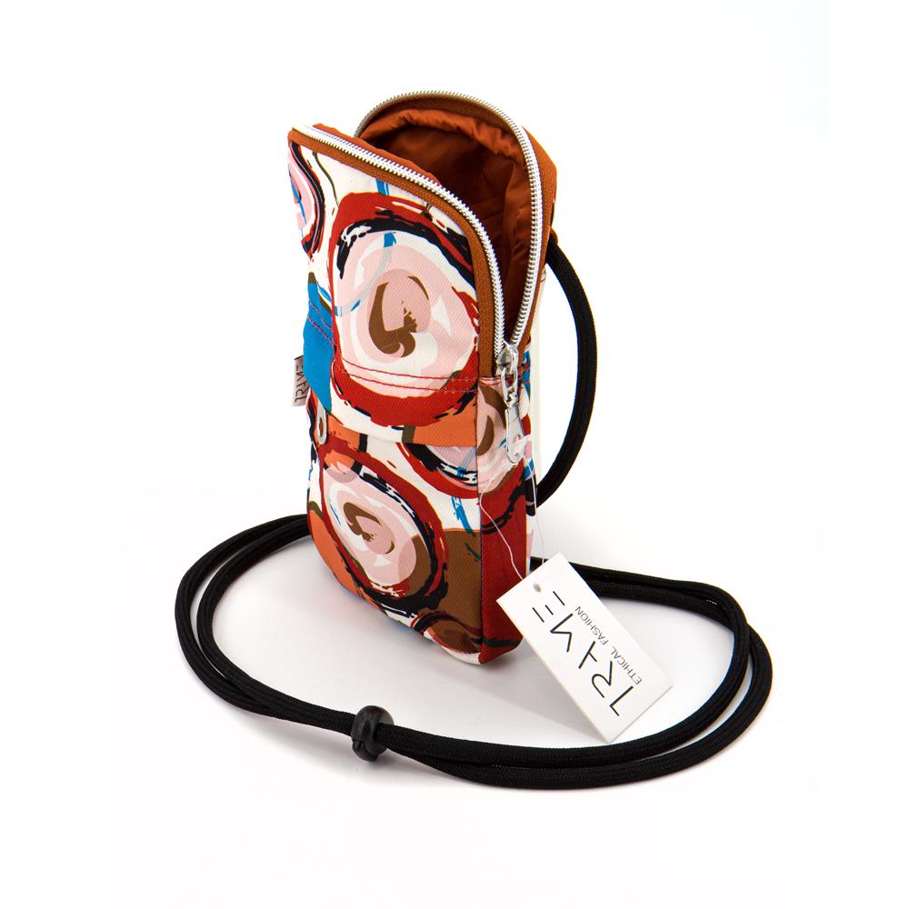 Borsellino da viaggio in tessuto PVC impermeabile. Stampa cerchi multicolore su colore base bianco. Cordoncino regolabile. Chiusura con zip. Tasca frontale esterna con zip. Interno foderato. Tasca piatta esterna sul retro 11x18x2cm