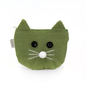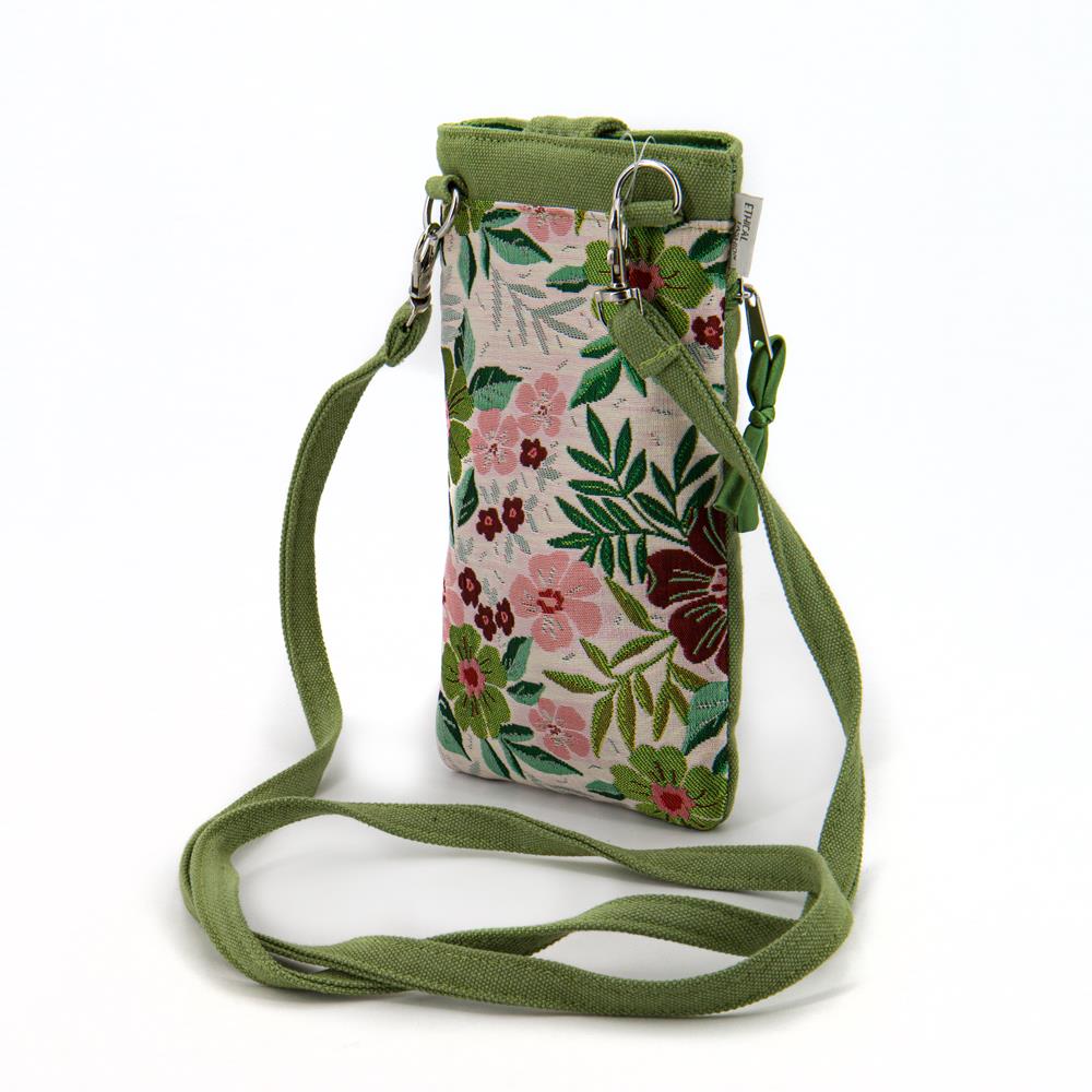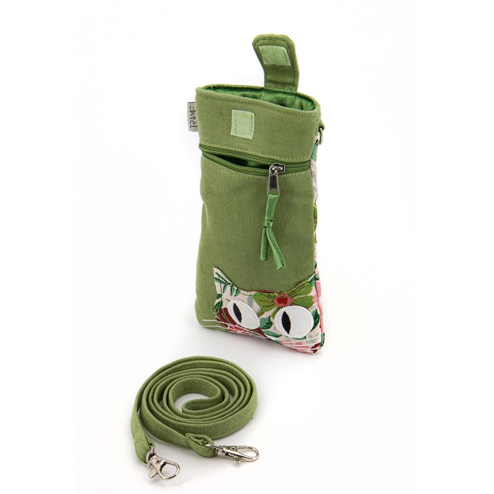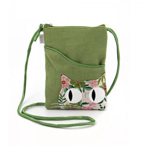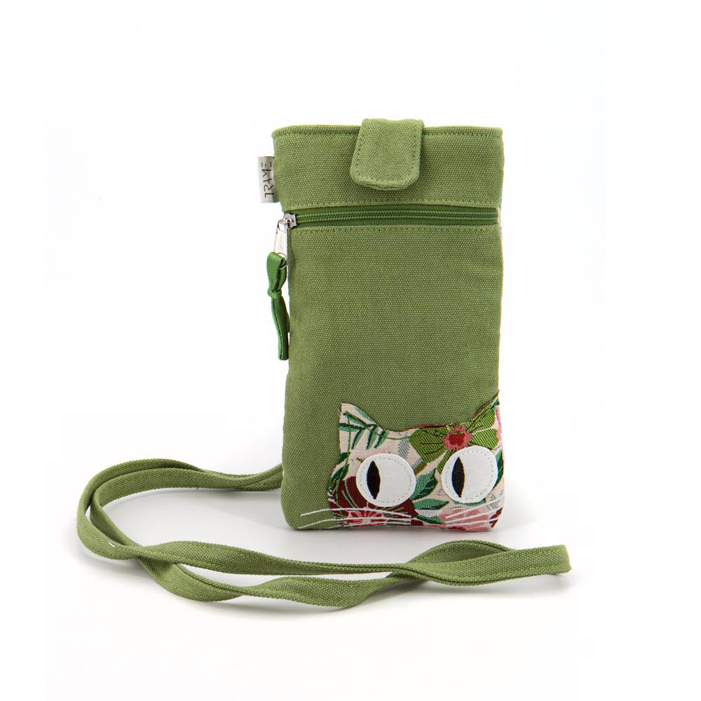 Portacellulare in cotone canvas colore verde e applicazione frontale gatto in cotone broccato con fantasia floreale. Retro in cotone broccato con fantasia floreale. Composto da tracolla rimovibile, chiusura con velcro, tasca con zip frontale. 11x19x12 cm