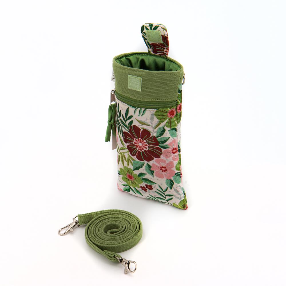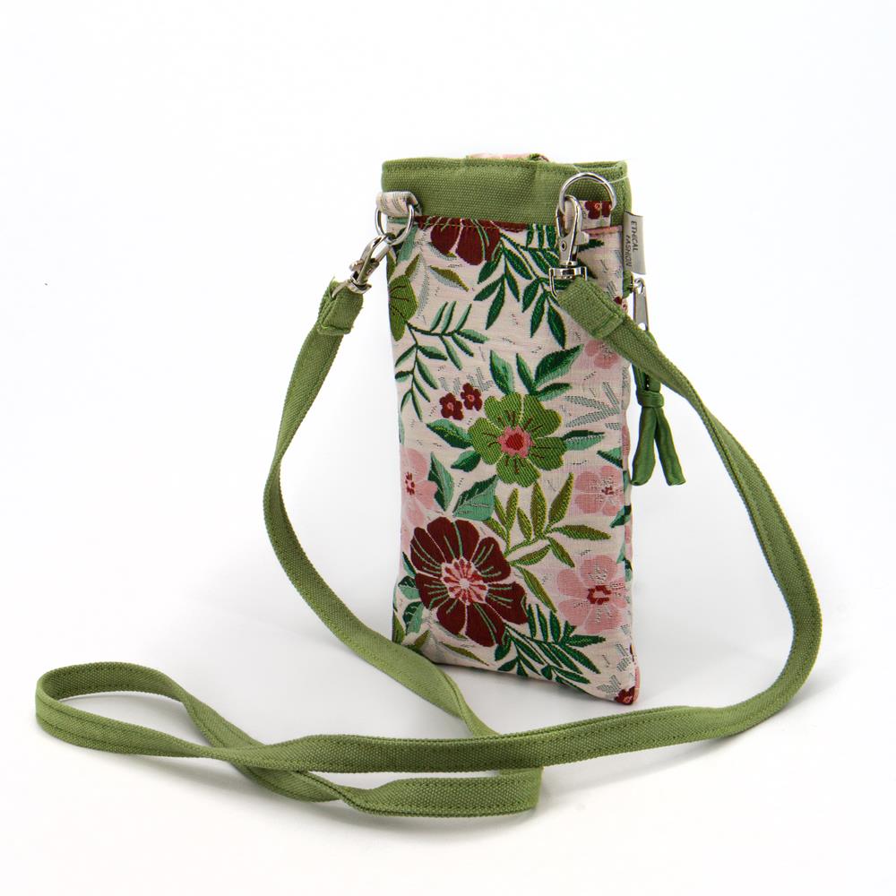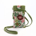 Portacellulare in cotone broccato fantasia floreale colore base cipria e cotone canvas colore verde. Composto da tracolla rimovibile, chiusura con velcro, tasca con zip frontale. 11x 19x 120cm