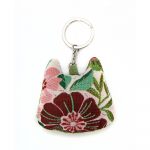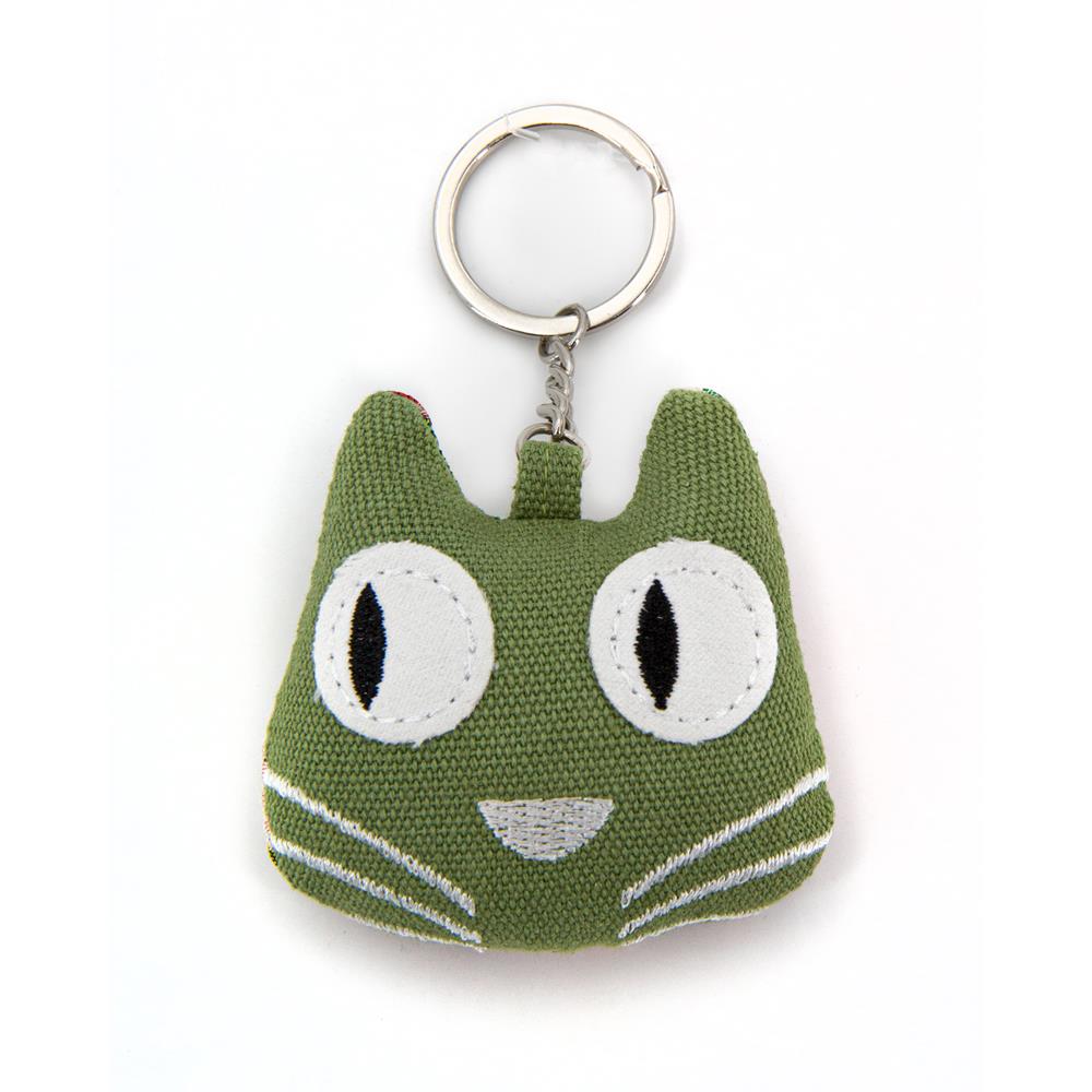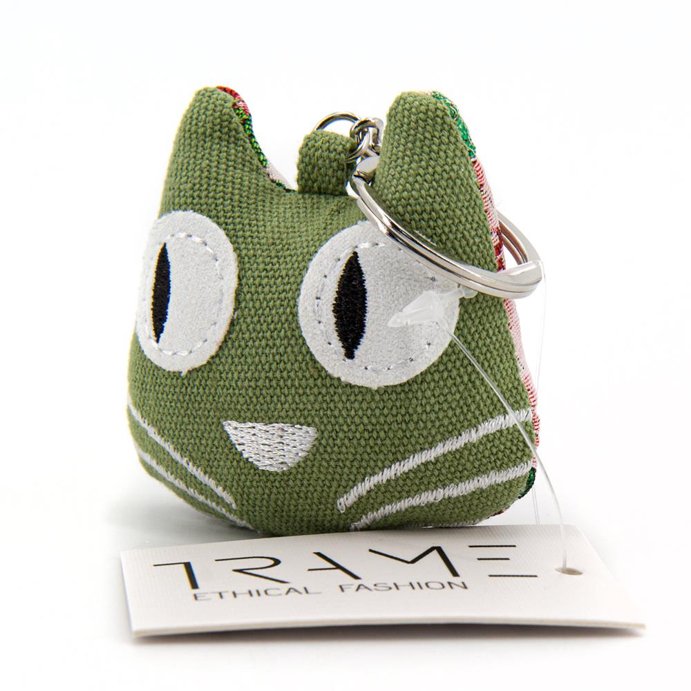 Portachiavi a forma di gatto in cotone canvas verde e con il retro in cotone broccato con fantasia floreale. 6×5 cm