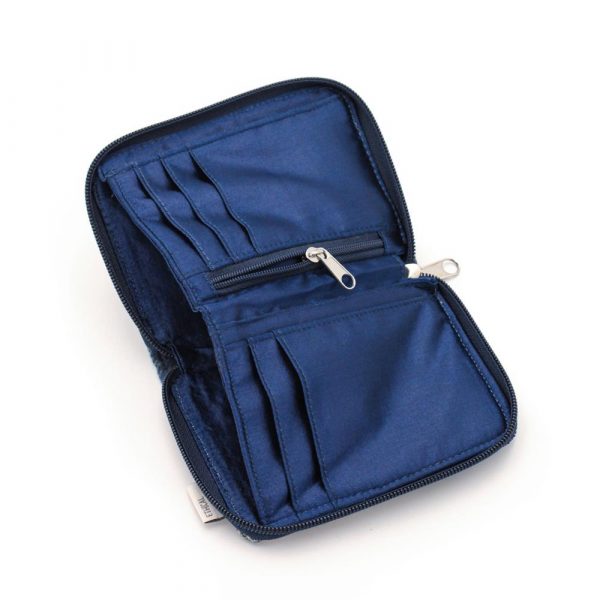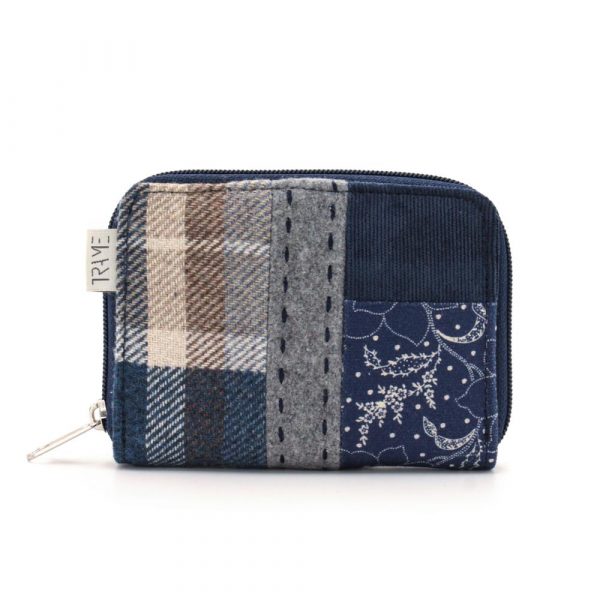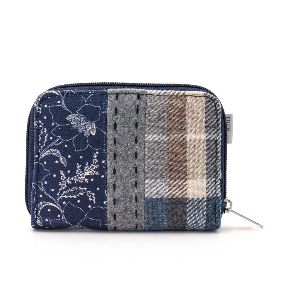 Portoglio donna in mix di tessuti e fantasie su base di cotone spesso. Chiusura con zip. Interno foderato con portadocumenti e zip interna per portamonete.