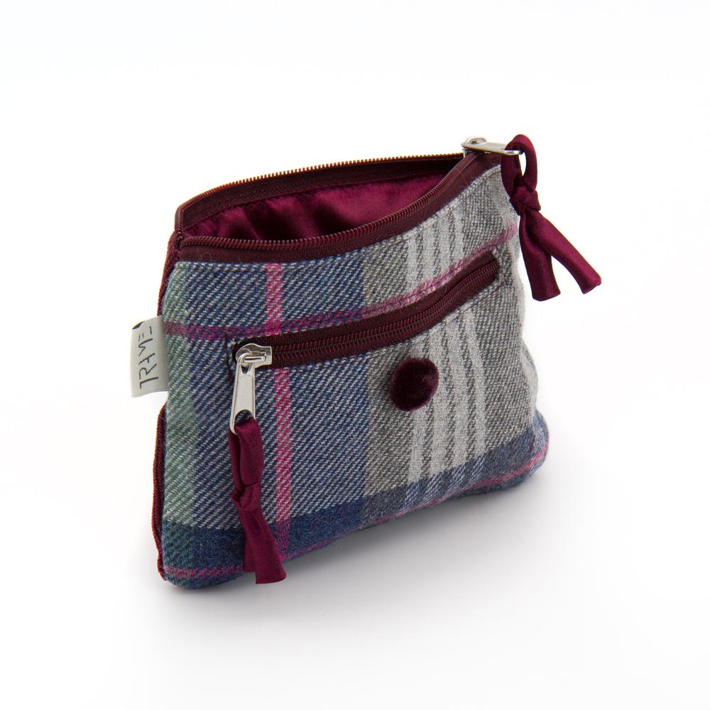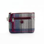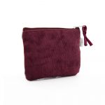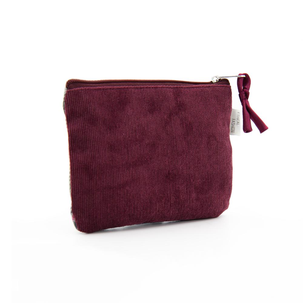 Portamonete in tweed e velluto a coste bordeaux. Chiusura con zip. Interno foderato. Tasca esterna con zip.