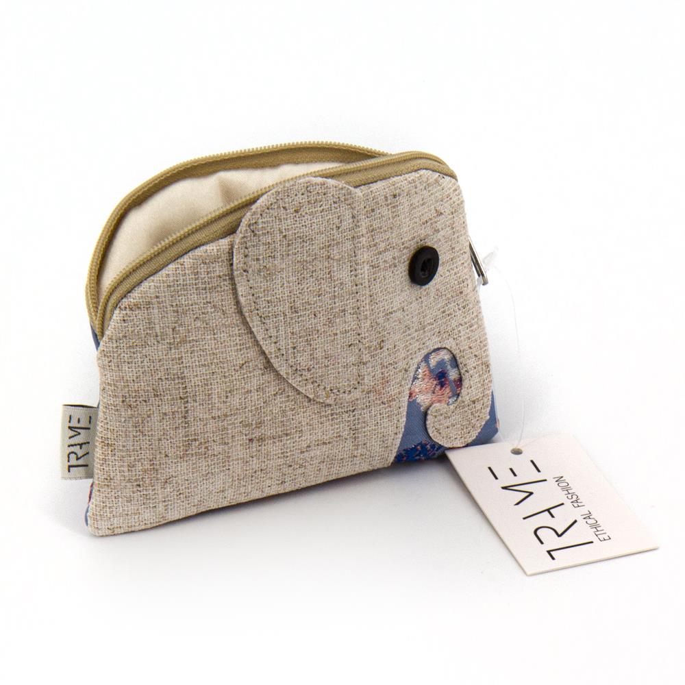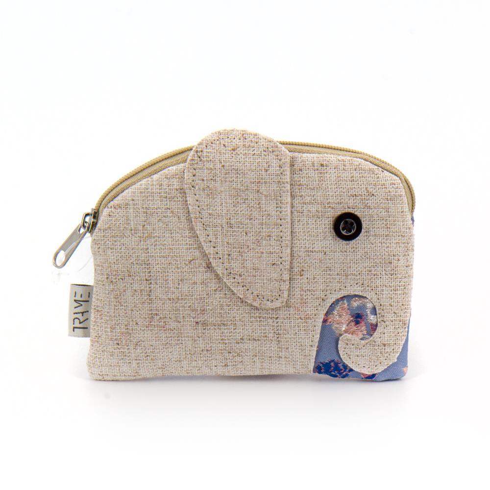 Portamonete a forma di elefante in mix di tessuti e fantasie su base lino ecrù. 12×10 cm