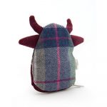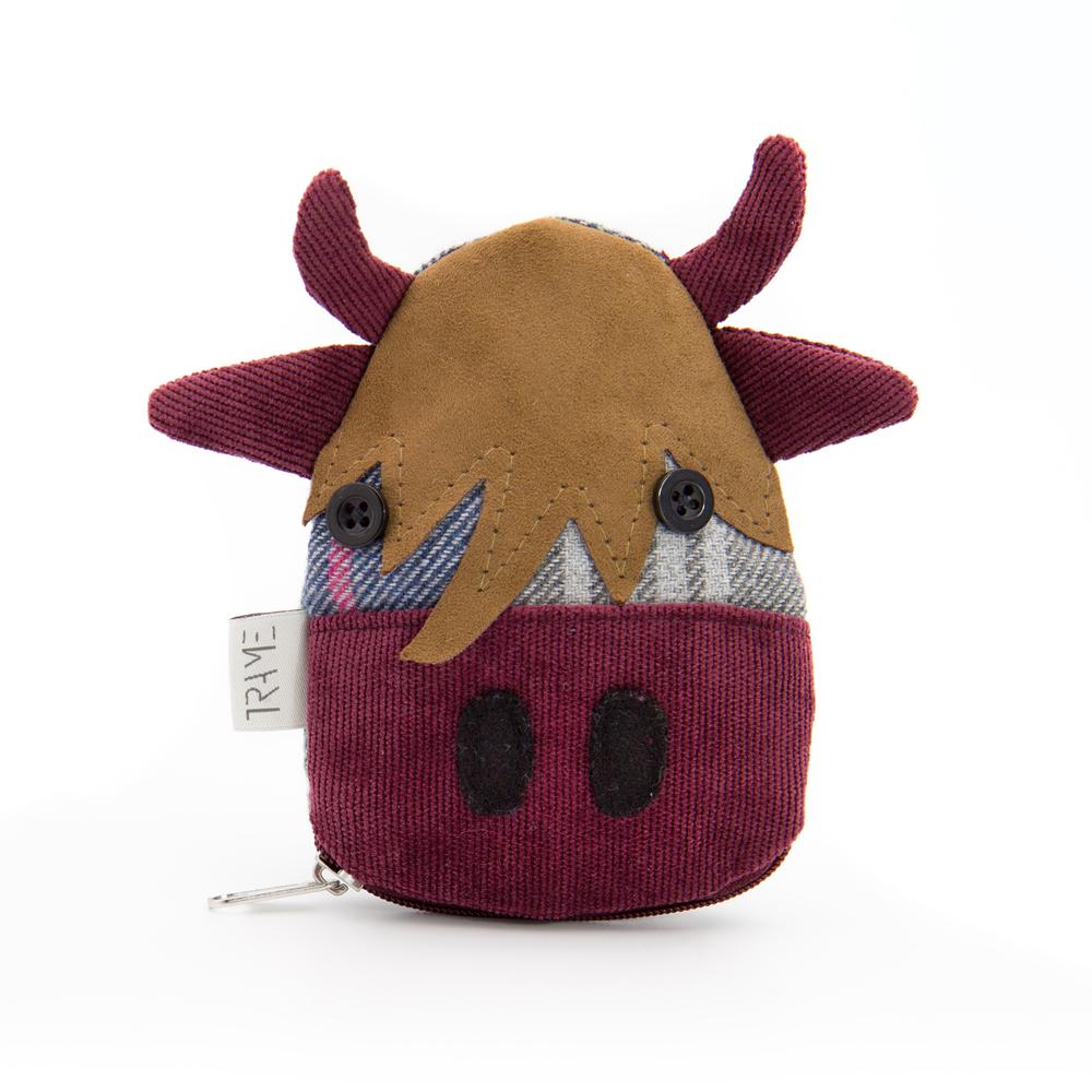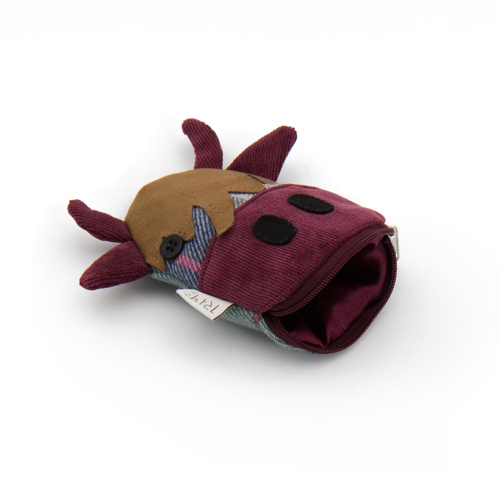 Portamonete in tweed e velluto a coste bordeaux a forma di mucca. Chiusura con zip. Interno foderato.