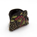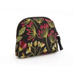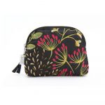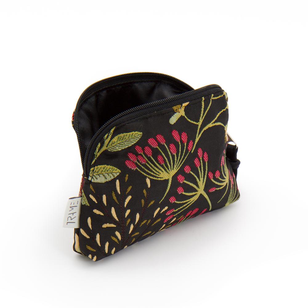 Portamonete dalla forma a prisma in broccato, fantasia floreale su colore base nero. Chiusura con zip. Interno foderato.