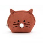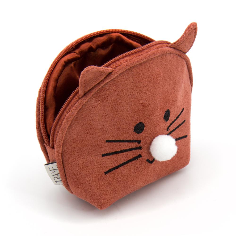 Portamonete a forma di gatto con base rigida in simil camoscio color ginger con retro in tessuto stampato a spina di pesce. Chiusura con zip.