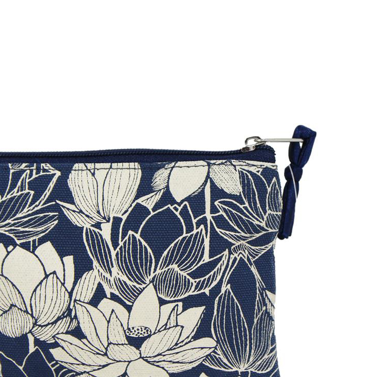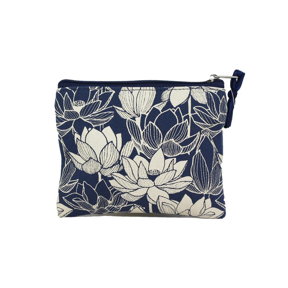 Portamonete in canvas con fantasia floreale su base blu. Chiusura con zip. Interno foderato.