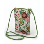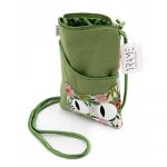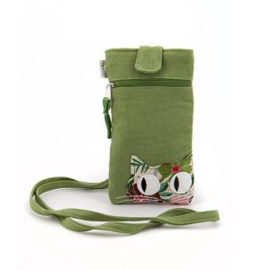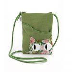 Portapassaporto con tracolla in cotone canvas colore verde e applicazione frontale gatto in cotone broccato con fantasia floreale. Retro in cotone broccato con fantasia floreale. Tasca anteriore a scomparto. Chiusura con zip. Interno foderato e tasca con zip. 16x 20 cm