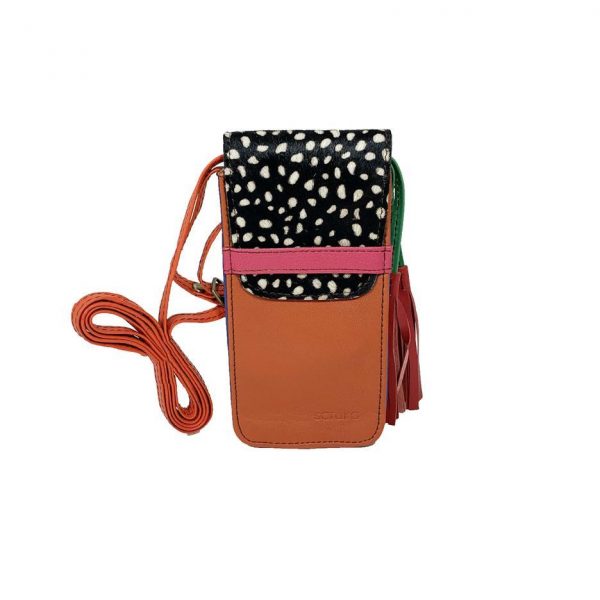 Portatelefono in pelle con stampa a pelo sulla patella. Il portatelefono si chiude a incastro della patella con una striscia di pelle.