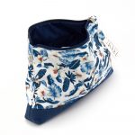 Portatrucco grande in cotone canvas stampato su colore base blu cobalto. Chiusura con zip. Interno foderato e due tasche piatte portaoggetti. 32x22x5 cm