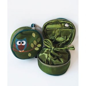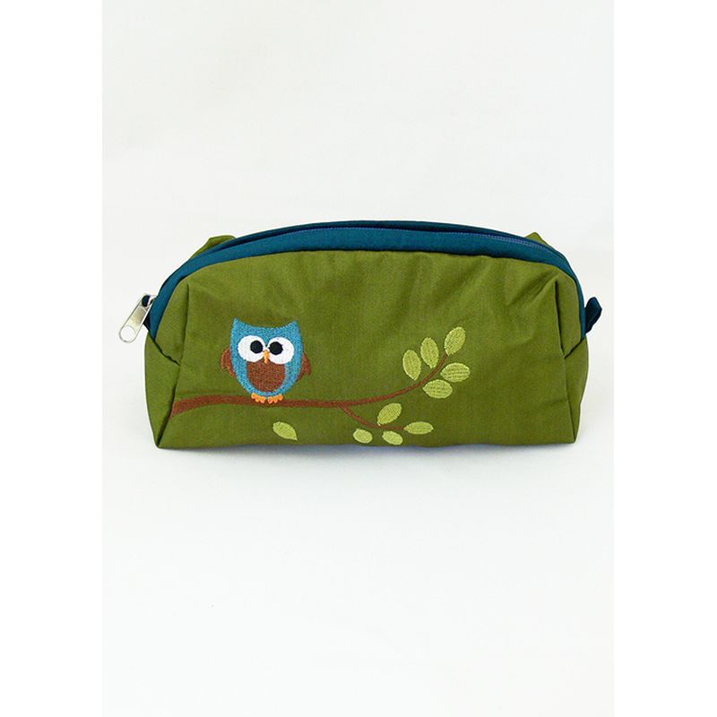 Portatrucco in seta verde con ricamo gufetto. Interno foderato con due tasche a scomparto.