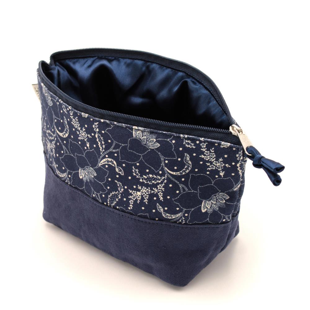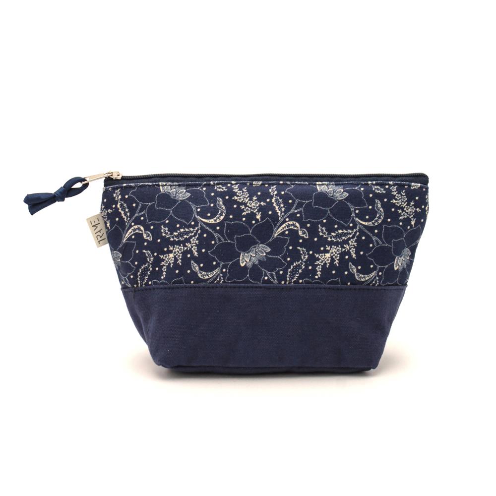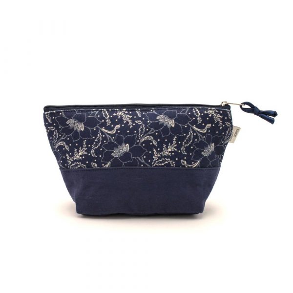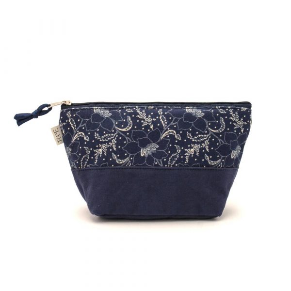 Portatrucco medio in cotone canvas stampato su colore base blu rodonite. Chiusura con zip. Interno foderato con due tasche a scomparto.