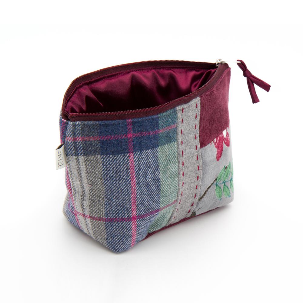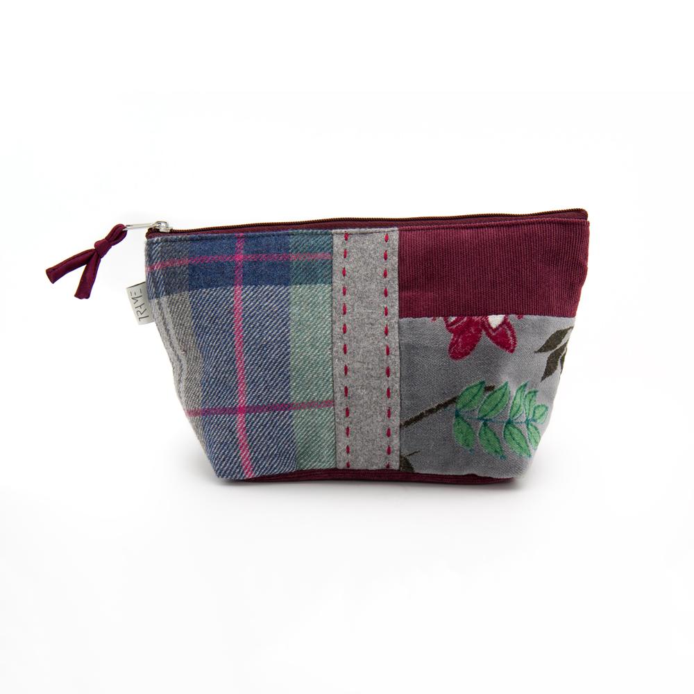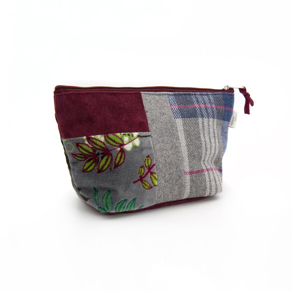 Portatrucco medio in mix di tessuti e fantasie su base di velluto a coste colore bordeaux. Chiusura con zip. Interno foderato.