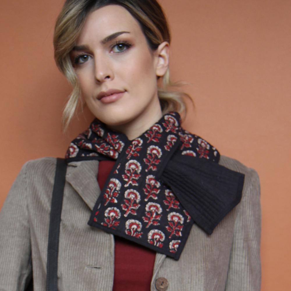 Scaldacollo reversibile, trapuntato in cotone stampato a mano block print disegno Girasoli, colore mattone e beige su sfondo nero.