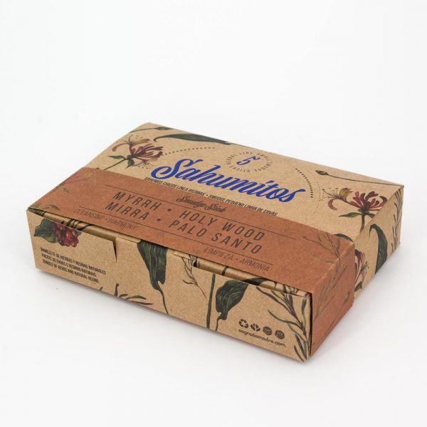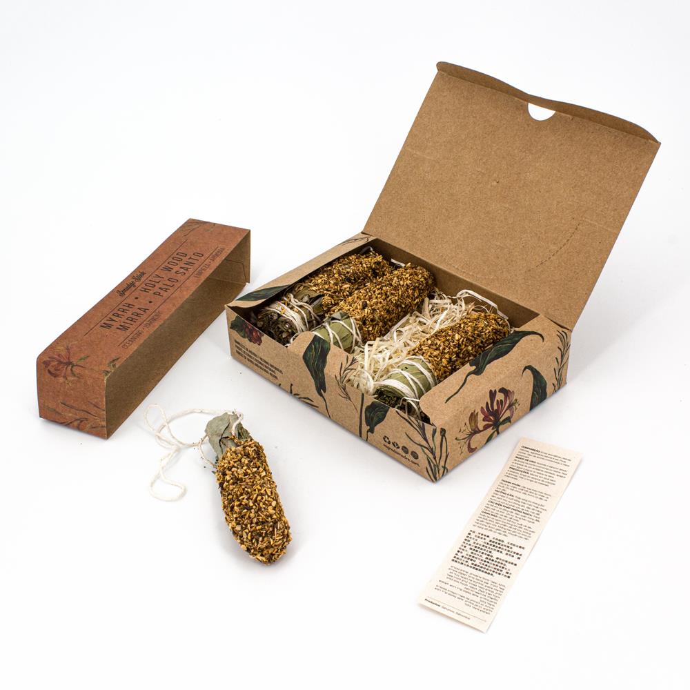 Composizione: erbe aromatiche (foglie di cedro, allora ed eucalipto), resine naturali, legante naturale, oli essenziali. Rivestimento esterno: mirra e palo santo.