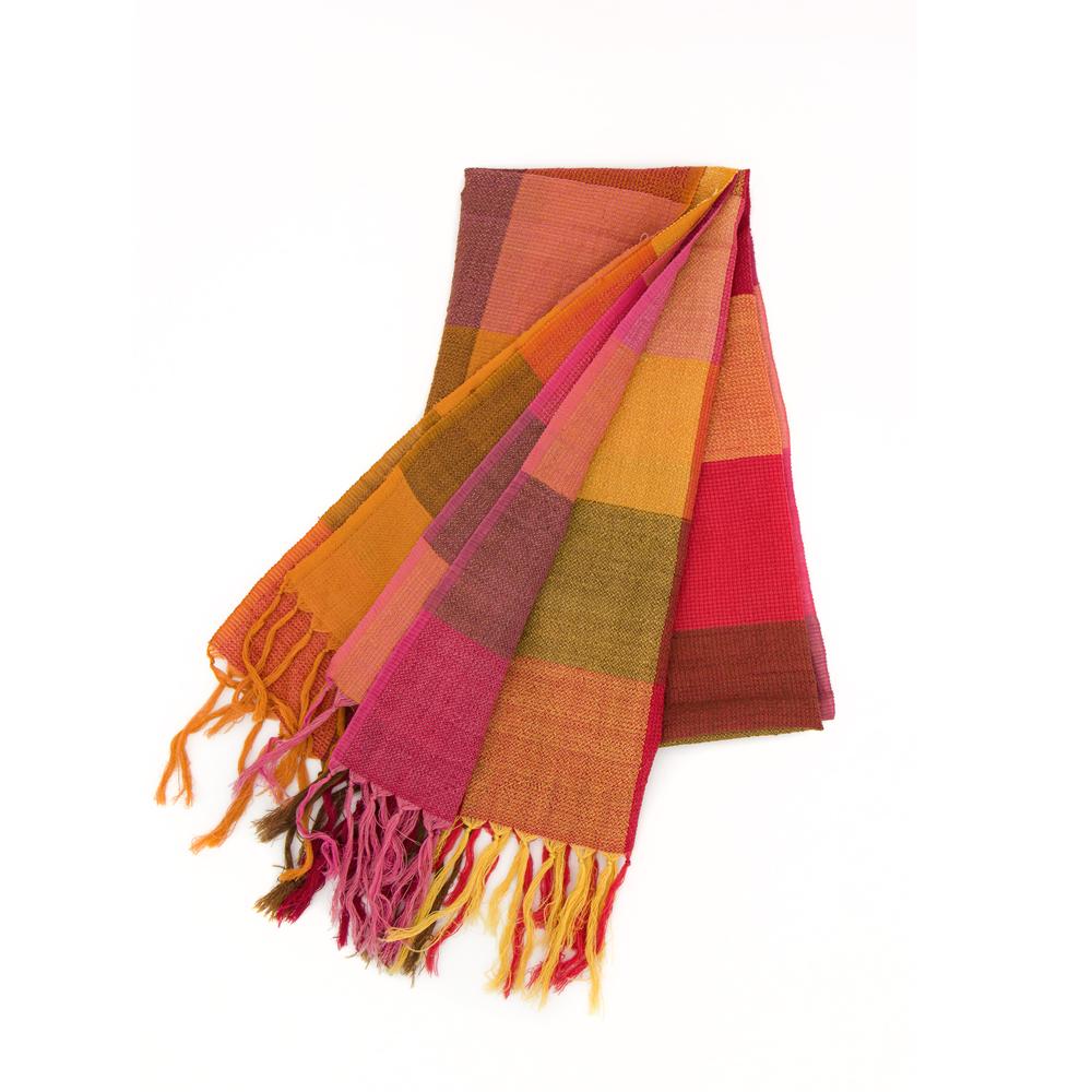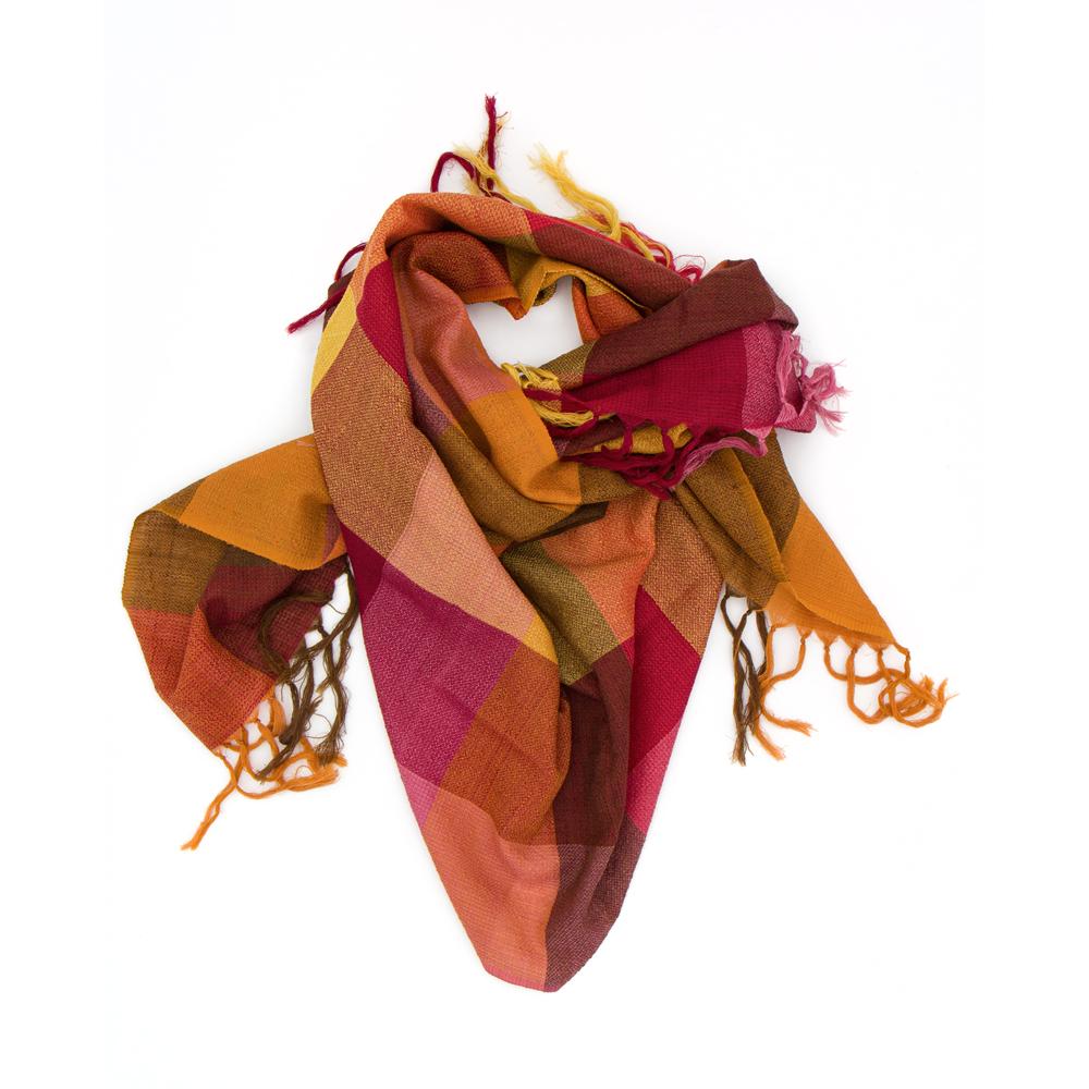 Stola in misto cotone bio e lana tessuta con telaio manuale, fantasia a scacchi sui toni del rosso e arancio