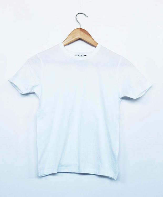 Maglia girocollo manica corta, collo in doppio rib 2 cm con cucitura ribattuta a due aghi, bordo inferiore e bordi maniche rifiniti con cucitura ribattuta a due aghi.