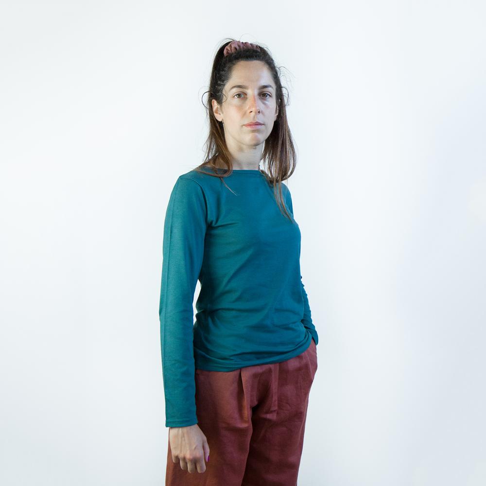 T-shirt donna manica lunga Bateau color petrolio 100% cotone certificata GOTS e Fairtrade jersey cotone 145 g