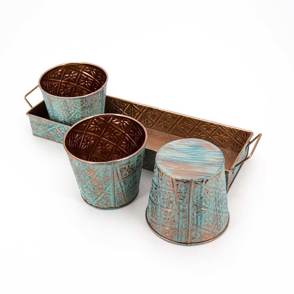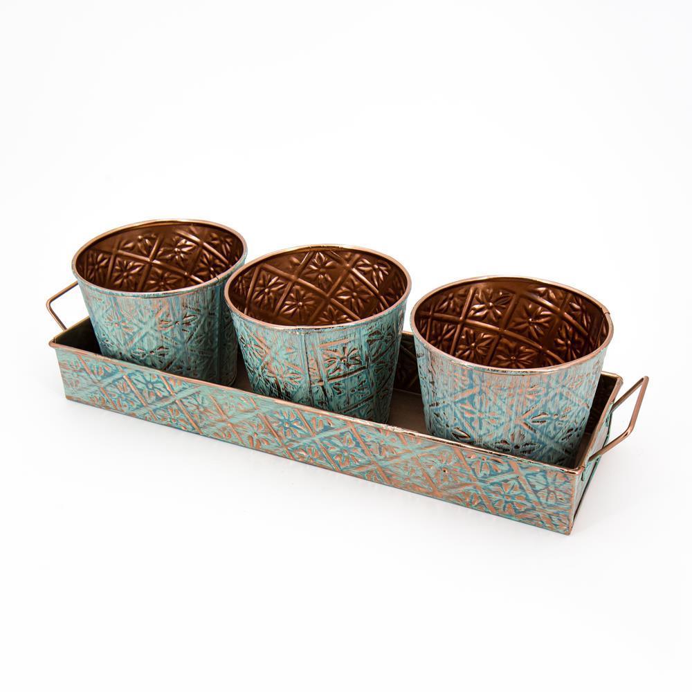Vassoio con 3 portavaso metallo bronzo azzurro 44x12x11cm