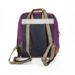 Zaino in pelle riciclata con struttura semirigida, pannelli cuciti a vista e combinazioni di pellame variabili. Dotato di tasca frontale con cerniera, chiusura superiore, spallacci regolabili e interno foderato con scomparto aggiuntivo.
