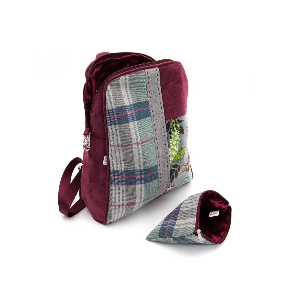 Zaino in mix di tessuti e fantasie su base di velluto a coste colore bordeaux . Chiusura con zip. Una tasca con zip esterna. Interno foderato e due tasche portaoggetti di cui una con zip. Dotato anche di un borsellino rimovibile.