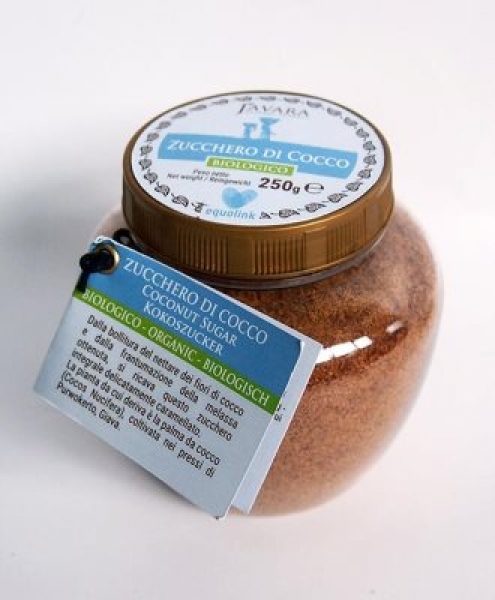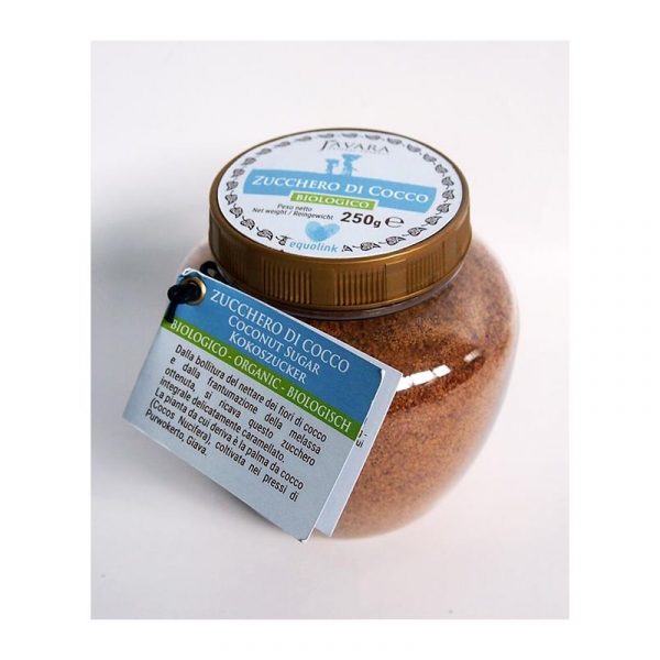Zucchero integrale di cocco ottenuto dalla macinazione del nettare di fiori di cocco, precedentemente cotto delicatamente e concentrato.