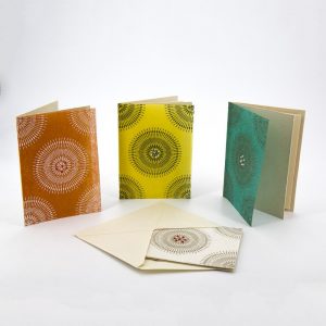 Con Prokritee, gruppo già conosciuto in Italia, abbiamo iniziato a lavorare nel 2007 dopo una serie di visite e contatti intercorsi nell’arco dei tre anni precedenti. Come nostra abitudine, abbiamo cercato di sviluppare delle linee di prodotto innovative, per non replicare articoli già presenti sul mercato. Per iniziare questa collaborazione abbiamo lavorato sui prodotti di carta artigianale facendo delle variazioni su materiale da loro sviluppato in precedenza. Le carte scelte sono fatte a mano e decorate con le tecniche del batik, dello stencil e della serigrafia.