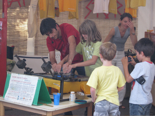 Mettete insieme 80 bambini, altrettante t-shirt eque e solidali, un telaio per la stampa artigianale su cotone e uno scatenato designer astigiano specializzato in serigrafia: avrete tutti gli ingredienti del laboratorio Stampiamo la maglietta giusta che abbiamo organizzato a Ferrara per Estate Bambini 2010 in collaborazione con l’Equilibreria le pagine. Giampiero Monaca, dello studio Artègrafica, ha tenuto il laboratorio, raccontando prima la storia del lungo viaggio delle magliette prodotte in Bangladesh da lavoratori tutelati, rispettati e pagati con equità, e successivamente ha aiutato i bambini presenti a cimentarsi nella tecnica della serigrafia. Un successone: i bambini hanno dimostrato interesse e impegno e si sono divertiti nell’esplorare la tecnica artigianale che è alla base delle attuali tecniche di stampa e nello scoprire quante storie si nascondono anche dietro a un oggetto semplice e quotidiano come una maglietta.